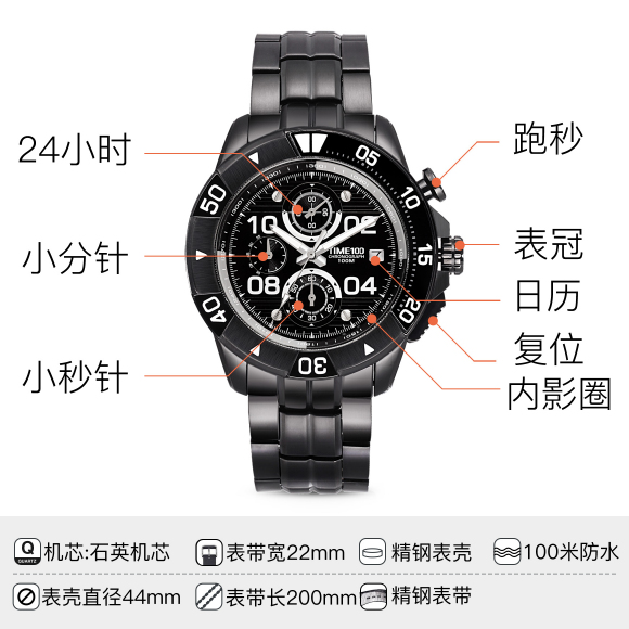 100米防水 时尚多功能精钢石英男表 (全国包邮)