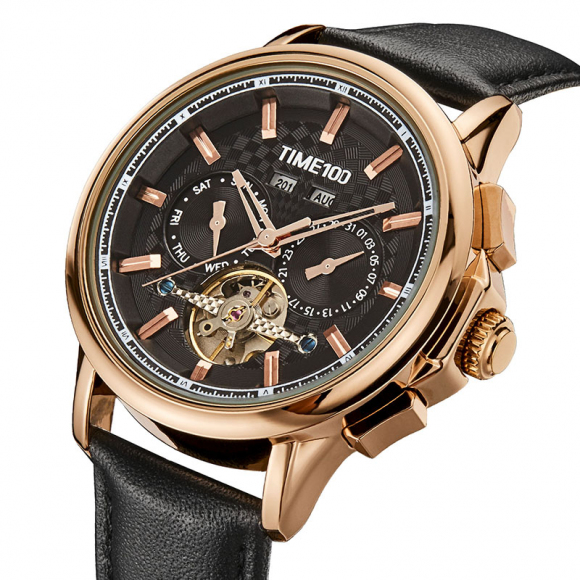 新款多功能年月日显示机械表时尚休闲牛皮带圆盘飞轮机芯指针男士手表