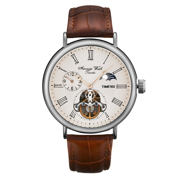 当前位置:首页 > 时尚复古罗马刻度简约风飞轮机芯多功能月相两地时男表牛皮圆盘防水机械表W60164G