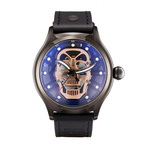 时光一百(TIME100)手表男时尚个性骷髅鬼脸弯刀镂空蓝色镀膜玻璃镜面男士手表车缝线牛皮圆盘防水男表